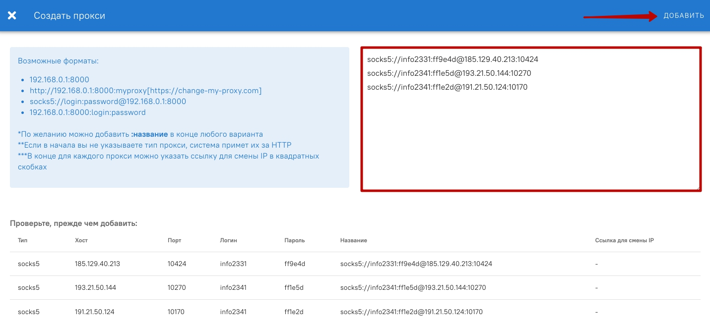 Добавьте прокси в соответствующее окошко. Для добавления прокси списком, напишите их в столбик одну под другой. После этого нажмите на “Добавить”