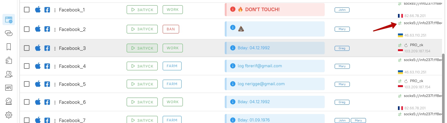 IP мобильной прокси вы можете заменить в списке профилей, нажав на значок со стрелочками: