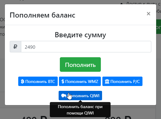 Вам необходимо нажать на Баланс, указать сумму в рублях и надать кнопку "Пополнить QIWI". Вас перенаправит на платежный шлюз системы QIWI для проведения платежа. После оплаты зачисление происходит мгновенно.